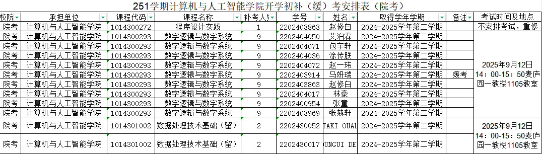 251学期计算机与人工智能学院开学初补(缓)考安排表(院考)