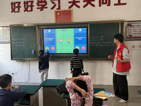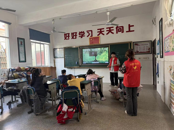 活动伊始,支教队员用活泼有趣的开场白引入主题:“小朋友们,今天是一个和绿色有关的特别日子,一棵棵小树苗能长成参天大树,一片片绿植能守护我们的家园,今天我们就一起解锁植树节的小知识,争做护绿小卫士。” 随后,队员们播放了精心制作的科普短片,短片中生动的植物生长画面、清晰的生态保护知识,配合队员们通俗易懂的讲解,让孩子们了解到植树节的由来、树木的生态作用,以及爱护花草树木对于守护自然环境、建设美丽家园的重要意义。队员们还分享了身边的植绿护绿小故事,用具体的事例让孩子们直观感受绿色家园的美好,体会守护生态的责任。