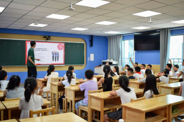 行动伊始,实践队便将机制建设置于首位。7月29日,在开阳县第二小学,实践队与县教育局、语委办及校方召开专题座谈会。开阳县第二小学校长况时昌对实践队表示热烈欢迎,并阐述了学校推广普通话的坚定决心和已有举措。县教育科学培训中心党支部书记袁仁刚提出“保护方言文化”与“推广国家通用语”并重的指导方针。实践队指导老师李昱代表团队承诺,将发挥高校专业优势,为基层提供精准长效的语言服务支撑。县语委办负责人陈海燕详细介绍了当地推普常态化机制,包括课堂普通话强制使用、经典诵读大赛、推普周活动及严格的教师普通话等级要求。此次座谈为实践队后续精准施策奠定了坚实基础。
