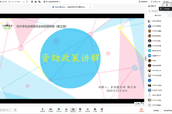 12月15日晚,寒意渐浓,计算机与人工智能学院的线上会议室里却暖意流动。一场由学院大学生自律委员会资助服务部精心策划的“资助政策:线上小讲解”活动在腾讯会议平台如期举行,以“云端对话”的方式,将学校的温暖政策送到每一位学子的“手边”。